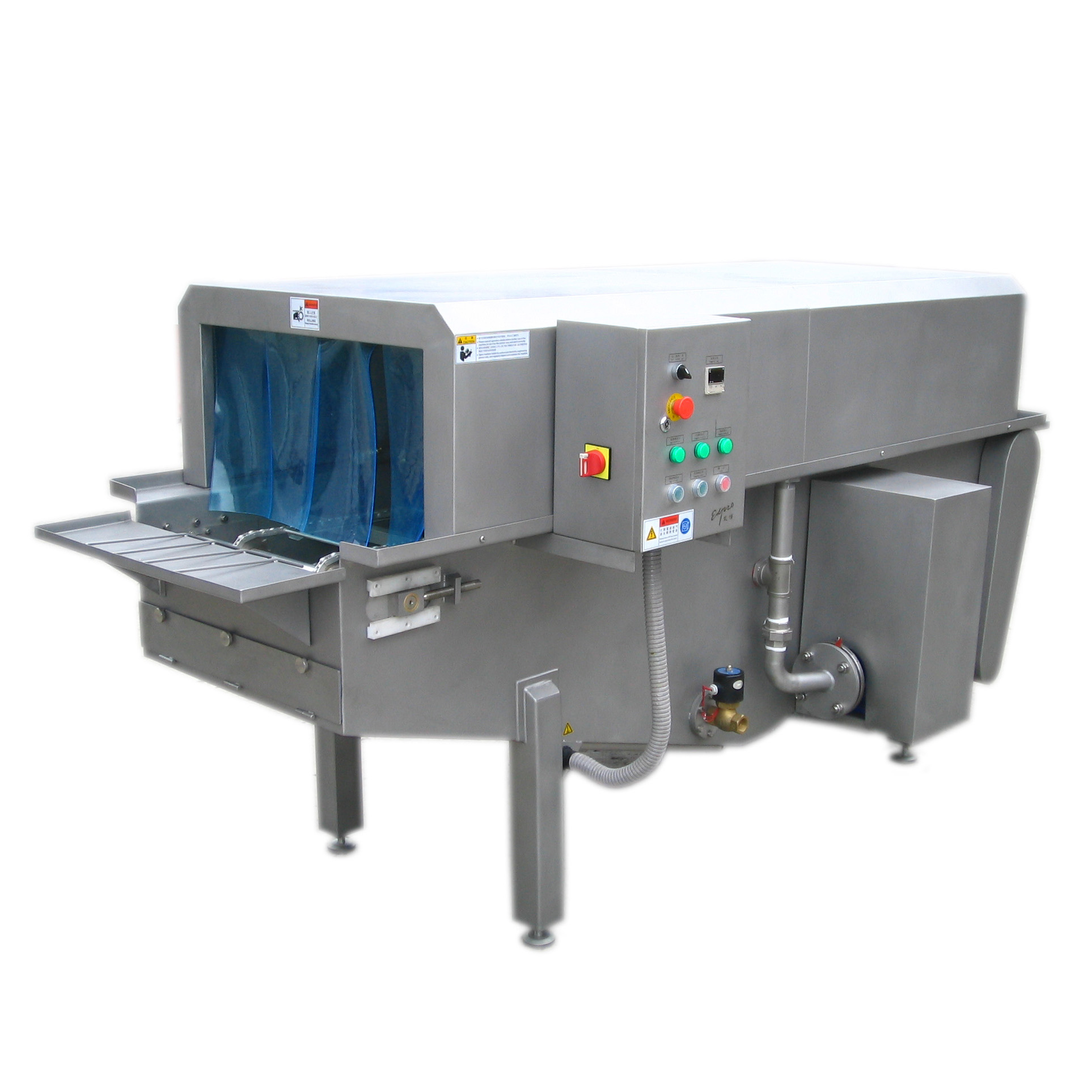 BXXJ-I 洗箱机装有循环水过滤、高压喷射、自动输送、防溅水装置,配装有水温控制系统。常规配置采用外接蒸汽加热,但根据用户需要还可改为电加热。该机装有一个循环泵,用于带清洗液的温水或清洁水。根据输送结构的变换,该机可用于周转箱、周转盘、火腿模具及高温灭菌包装袋的表面清洗。