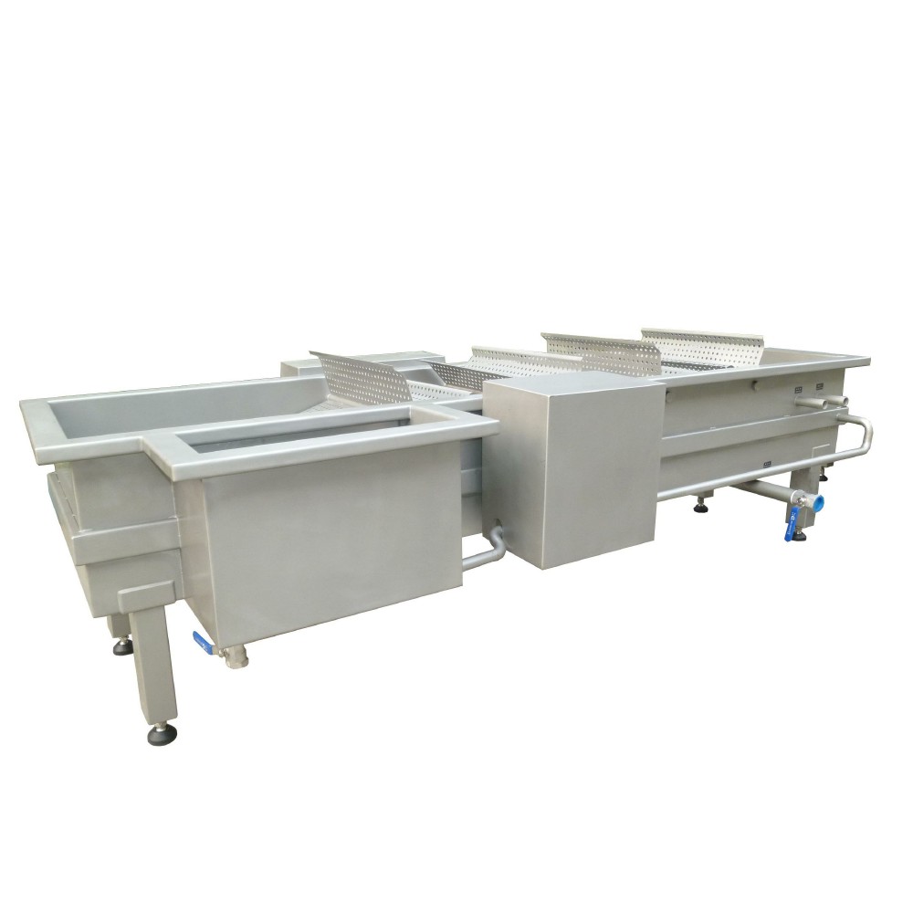 BWLJ肉丸冷却机用于水煮肉丸的冷却。从肉丸水煮(定型)机熟制后的肉丸经提升机送入肉丸冷却机,通过冷水的循环及转动的拨轮,将肉丸往前推动,直至水槽终端。该机配有盛放碎冰的冷却槽,也可直加装制冷设施。