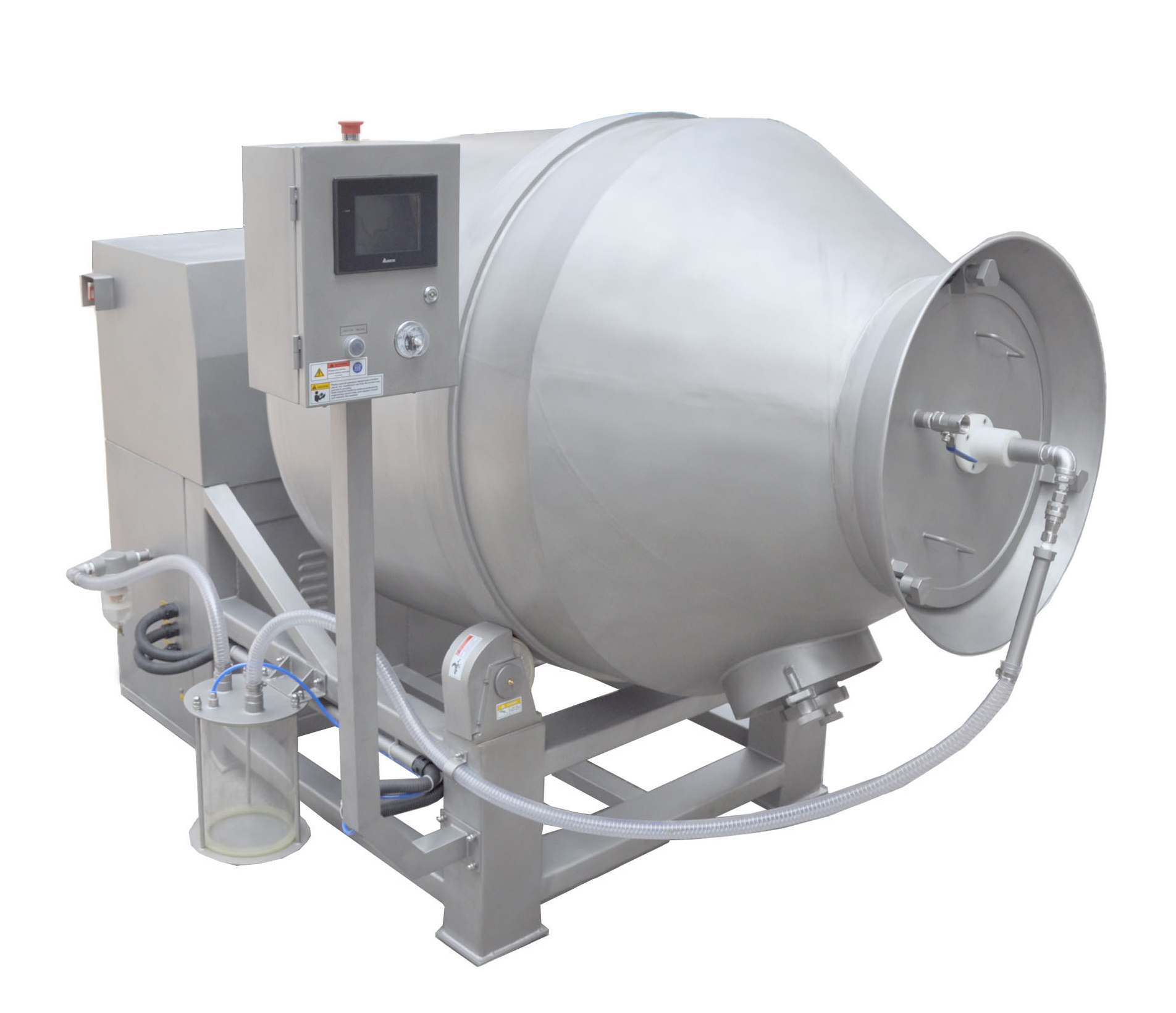 整机由优质不锈钢SUS304 制造。BVRJ-3000 真空滚揉机是在真空状态下将肉块进行滚揉(按摩),起到肉质嫩化,充分吸收盐水,使蛋白质充分溶解的作用。该机有二种速度可以选择,采用真空呼吸循环和吸料装置,使滚揉效果更趋完美和方便装料。控制采用PLC系统,也可根据用户要求,更换成常规电器元件控制。