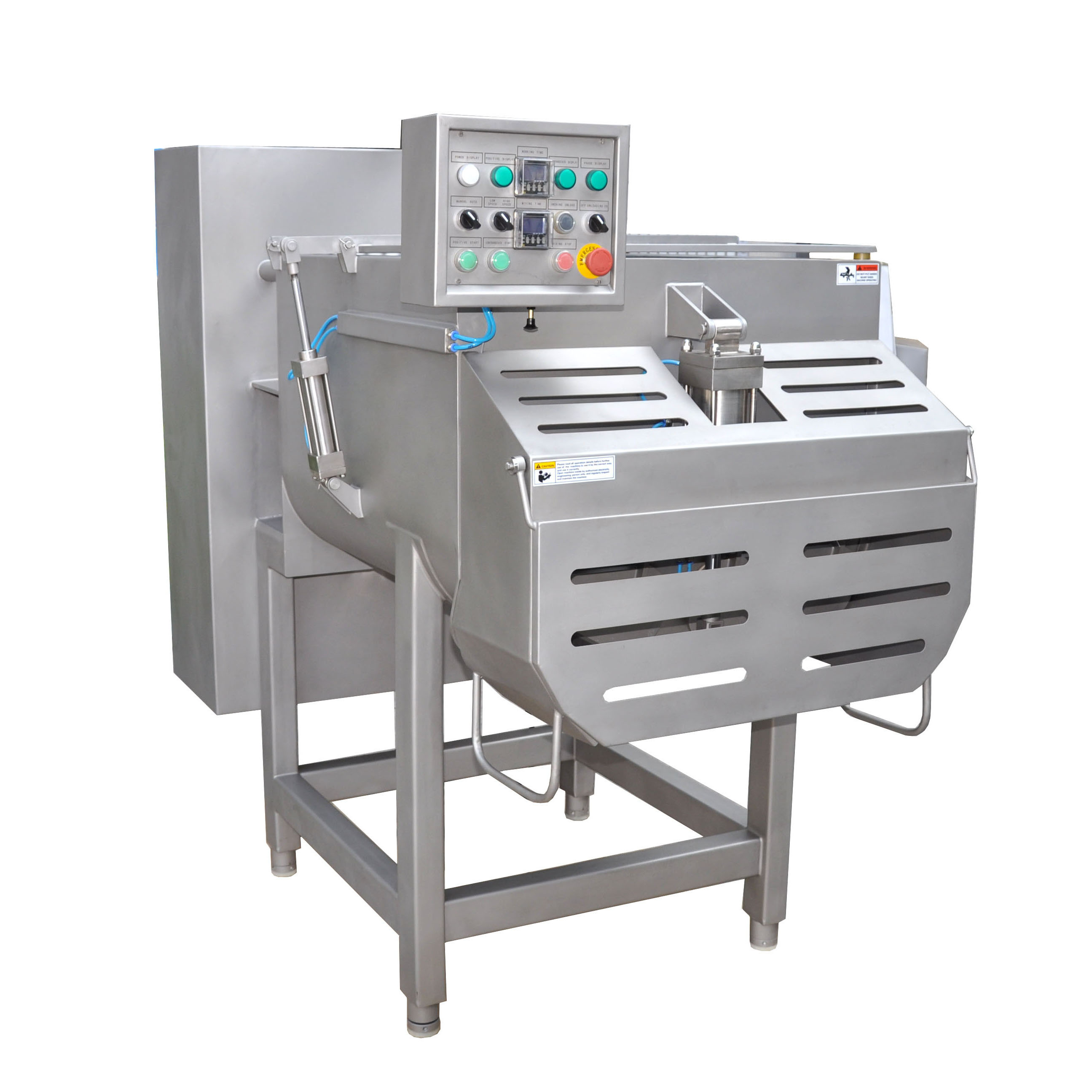 整机由优质不锈钢SUS304 制造。BJBJ-750搅拌机为双轴搅拌,设有正反转和暂停时间装置,挤压式推进,气动出料,上盖及出肉口均装有安全保护装置。不同的搅拌浆叶可根据用户需求提供。