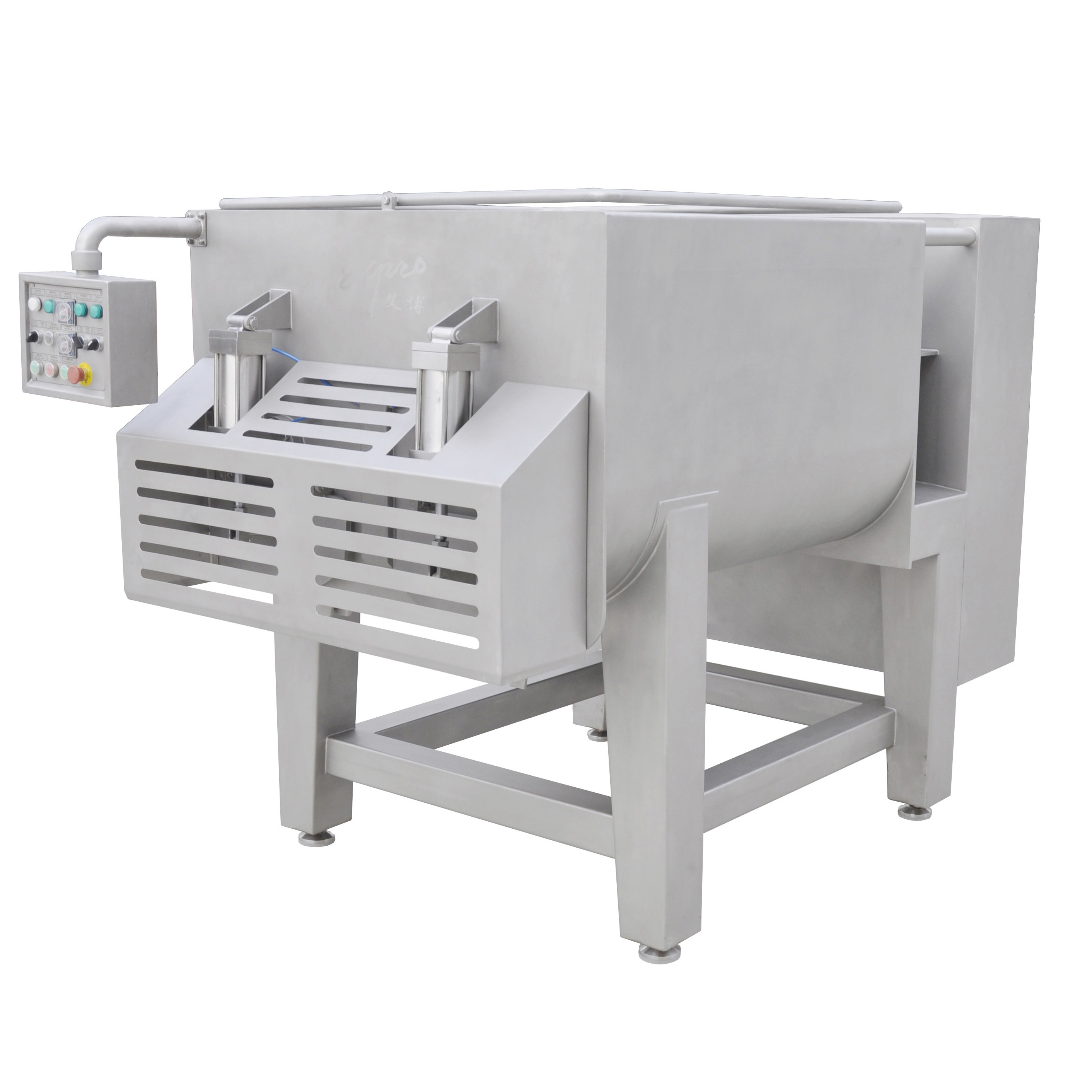 整机由优质不锈钢SUS304制造。BJBJ-1000搅拌机为双轴搅拌,设有正反转和暂停时间装置,挤压式推进,气动出料,上盖及出肉口均装有安全保护装置。不同的搅拌浆叶可根据用户需求提供。